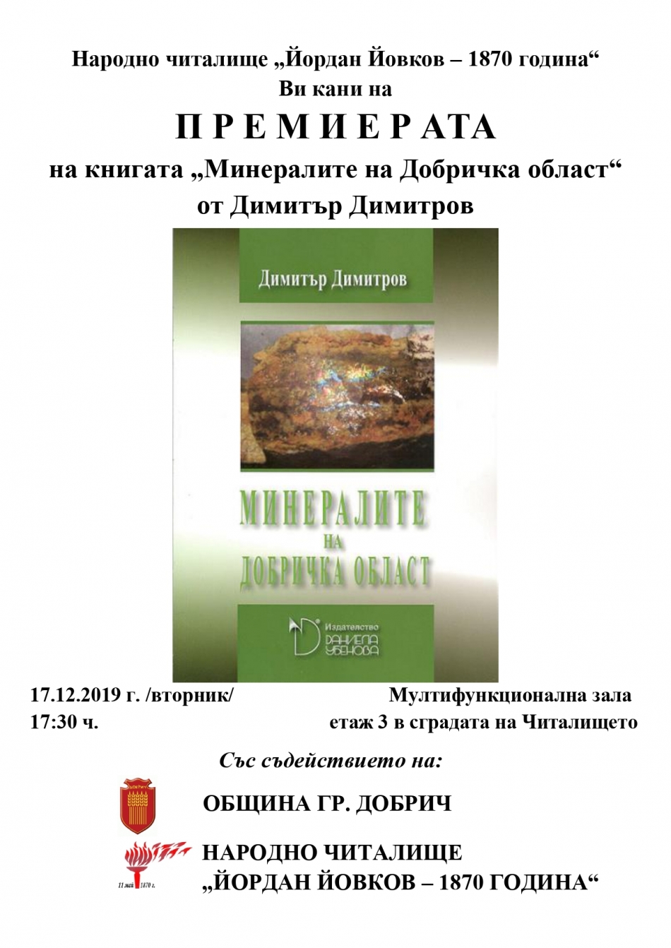 Премиера на книгата „Минералите на Добричка област“ на Димитър Димитров ще се състои днес (17 декември) от 17:30 часа в Мултифункционалната зала на Народно читалище „Йордан Йовков – 1870 година”.
