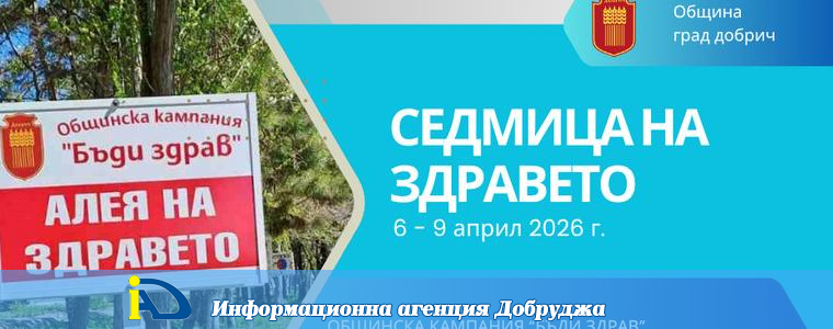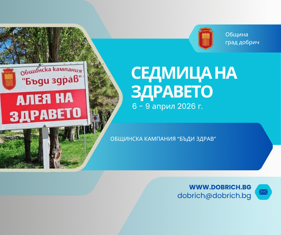 От 6 до 9 април Община град Добрич организира традиционната кампания „Бъди здрав“, посветена на Световния ден на здравето. В рамките на инициативата са предвидени дни на отворените врати в общинските лечебни заведения, безплатни консултации и изследвания, както и поредица от събития за всички възрасти.