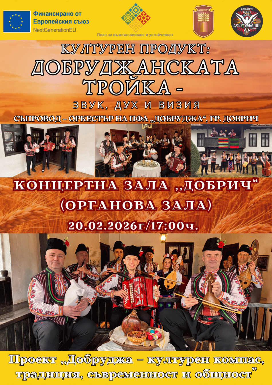Културното събитие „Добруджанската тройка - звук, дух и визия“ ще се проведе на ново място, съобщават организаторите. Представянето на културния продукт ще се състои в Концертна зала „Добрич“ (Органова зала). Събитието ще се проведе на 20 февруари 2026 г. от 17:00 часа. „Добруджанската тройка – звук, дух и визия“ ще предложи на публиката въздействащо преживяване, което съчетава традиционния добруджански фолклор с модерно художествено внушение. Проектът акцентира върху съхраняването и популяризирането на местното културно наследство, като изгражда връзка между минало и настояще, между общност и сцена. Музикалният съпровод ще бъде поверен на оркестъра на ПФА „Добруджа“ – гр. Добрич, чийто професионализъм и принос към развитието на фолклорното изкуство са гаранция за високо художествено ниво. Събитието се реализира в рамките на проект „Добруджа – културен компас, традиция, съвременност и общност“, насочен към утвърждаване на културната идентичност на региона и активното участие на местната общност в културния живот. Очакваме ви, за да споделим заедно силата на добруджанския звук, дух и визия, допълват организаторите.