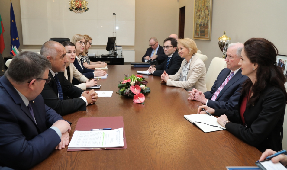 Премиерът Бойко Борисов се срещна с министъра на правосъдието и главен прокурор на САЩ Джеф Сешънс, който е на посещение в София. Фокус на разговора беше поставен върху споделения от двете страни ангажимент в борбата с международния тероризъм, трафика на наркотици, трафика на хора и защита на киберсигурността. Борисов и Сешънс дискутираха също така други области на двустранното сътрудничество в правоприлагането, включително екстрадициите и взаимната правна помощ.