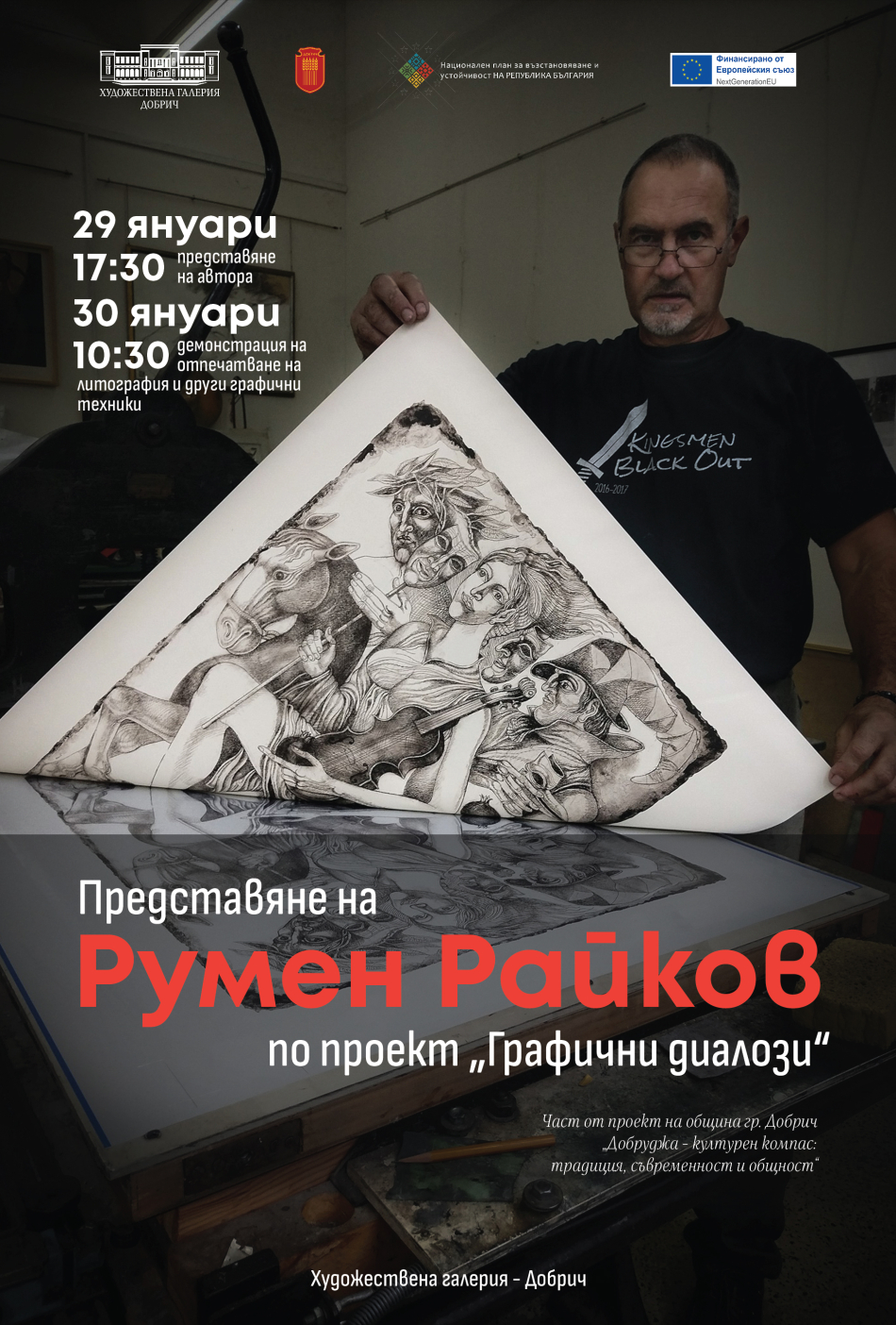 Среща с умдрукера във ВТУ „Св. Св. Кирил и Методий“ Румен Райков предстои на 29 януари от 17:30 ч. в Художествена глаерия - Добрич. Събитието е в рамките на проект „Графични диалози“ на ХГ - Добрич, част от проекта на Община град Добрич „Добруджа – културен компас: традиция, съвременност и общност“. Художникът ще представи литографията и своето творчество. На 30 януари графикът ще проведе демонстрация на отпечатване на различни графични техники с ученици от СУ „Св. Климент Охридски“ – Добрич.
