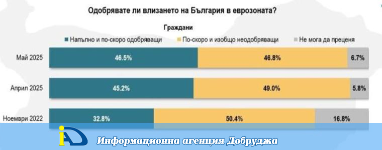 Спрямо 2022г., когато агенцията проведе аналогично проучване, е налице ръст на подкрепата за присъединяване към еврозоната. През 2022г. съотношението за и против е 33:50, през април 45 за срещу 49 против. Изявлението на президента Румен Радев за провеждането на референдум за готовността за приемане на еврото втвърдява и привърженици, и противници. През май регистрираме почти пълен паритет между двете групи – 46.5% одобряващи присъединяването ни и 46.8% не одобряващи. Силно положителни остават нагласите на бизнеса (66%:34%), като динамика в тях почти не се наблюдава.