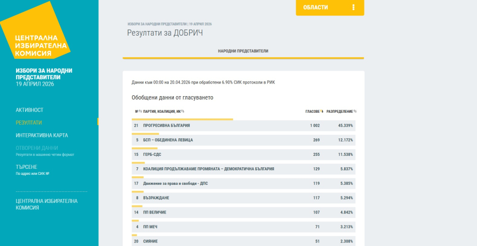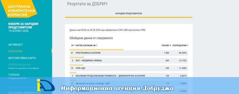 „Прогресивна България“ е с убедителна преднина в област Добрич според данни при 6,9% обработени протоколи, публикувани на сайта на Централната избирателна комисия.