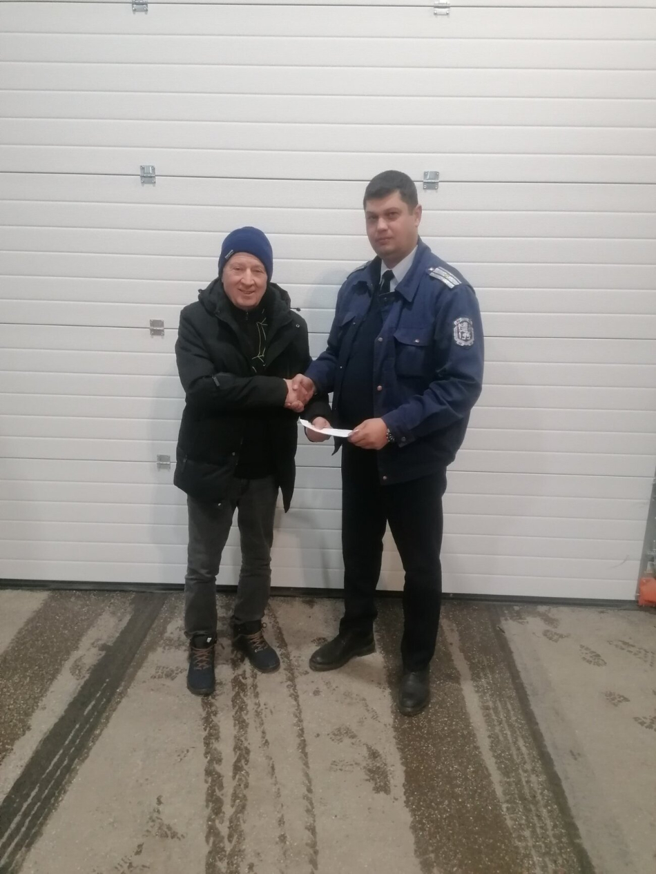 Служители от Пътна полиция от Шумен намериха и върнаха на 72-годишен мъж от Добрич парична сума, съобщават от ОД МВР-Шумен. Около 12:40 вчера в сградата за регистрация на автомобили двама униформени забелязали паднал на земята хартиен плик. При проверка установили, че в него има парична сума в размер на 480 евро и бележка от транзакция в банка. След извършена проверка установили титуляра на сметката.Оказало се, че е 72-годишен мъж от Добрич. Малко преди това, мъжът закупил лек автомобил от Шумен, а от сектор „Пътна полиция“ му издали транзитен номер. Полицейските служители се свързали по телефона с добричлията Иван Стефанов. След кратък разговор установил, че парите му липсват. Разбрал, че са намерени от служителите на реда. Мъжът се върнал в пътна полиция. Пликът с парите му били предадени от униформените.