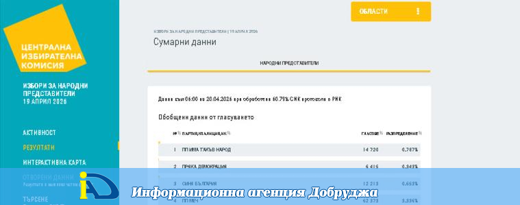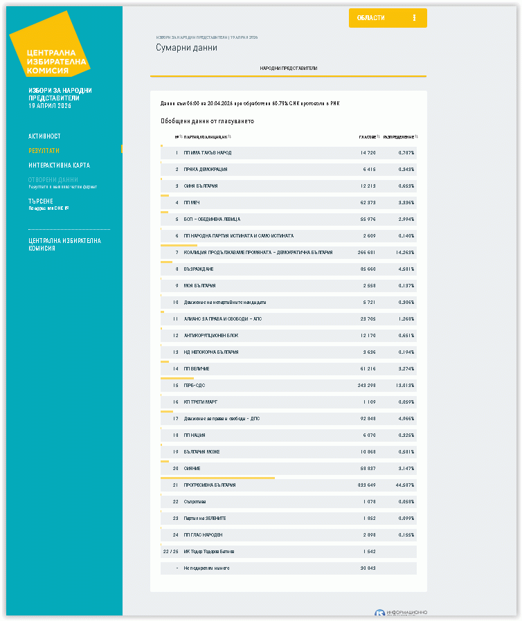 Показваме ви данни на ЦИК от 06 часа на 20.04.26 г. при обработени 60.59 % от протоколите на РИК в страната.