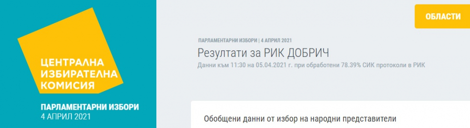 Обработени са малко над 78% от протоколите от секционните комисии в област Добрич, става ясно от сайта на ЦИК. На база на тях на първо място е коалицията ГЕРБ-СДС с 26.86%. Втори резултат за момента е за Коалиция "БСП за България" - 20.19%, трети са "Има такъв народ " с 17.32%. ДПС в област Добрич са четвърти с 7.05%, следва Демократична България с 5.57%, на шесто място са Изправи се! Мутри вън! с 4,77%. Останалите партии и коалиции са под 4-процентната бариера.