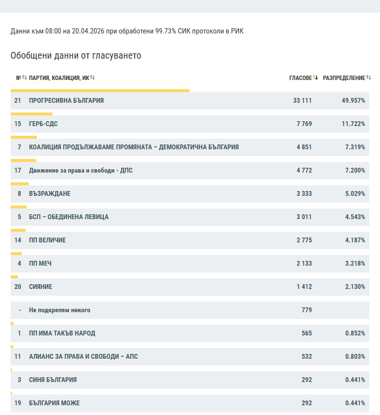 При 99,73% обработени протоколи в РИК, на първо място при изборите за народни представители в област Добрич „Прогресивна България“.