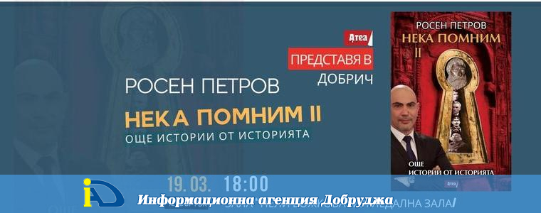 Новата книга на телевизионния водещ и журналист Росен Петров „Нека помним II. Още истории от историята“ ще бъде представена в Огледална зала „Нели Божкова“ в Добрич. Премиерата ще се състои на 19 март от 18.00 ч, а входът е свободен.