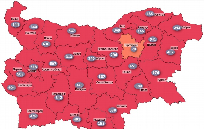 Цялата страна, с изключение на област Търговище, вече е в „червената“ зона по заболевамеост от коронавирус на 14-дневна база. Това показват актуалните данни на Националния център по заразни и паразитни болести. Област Добрич е с 243-ма заразени на 100 000 души население за първите 14 дни на месец март, като само 4 области в страната са с по-ниски показатели към момента. Пет са вече областите, при които заразените за последните две седмици са над 600 на 100 000 души. Това са Бургас, София-град, Кюстендил, Плевен и Враца.