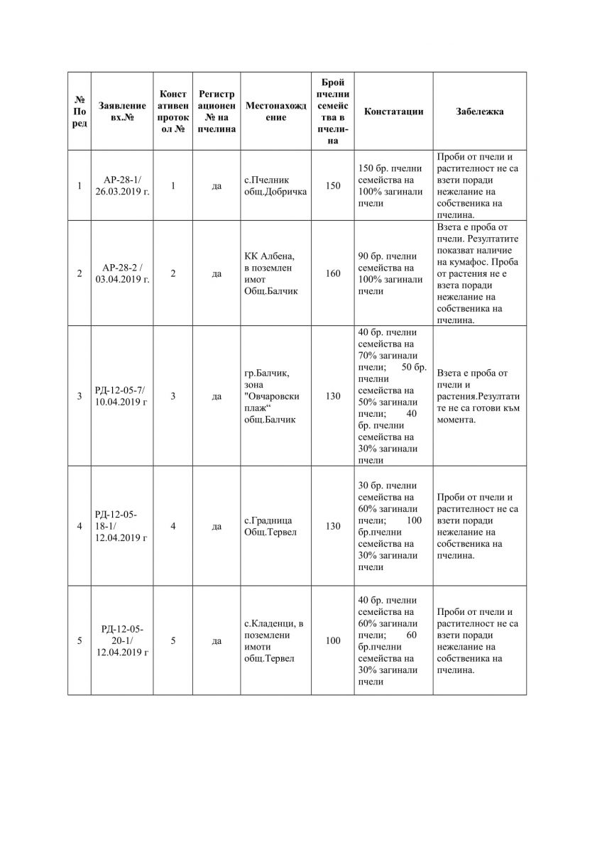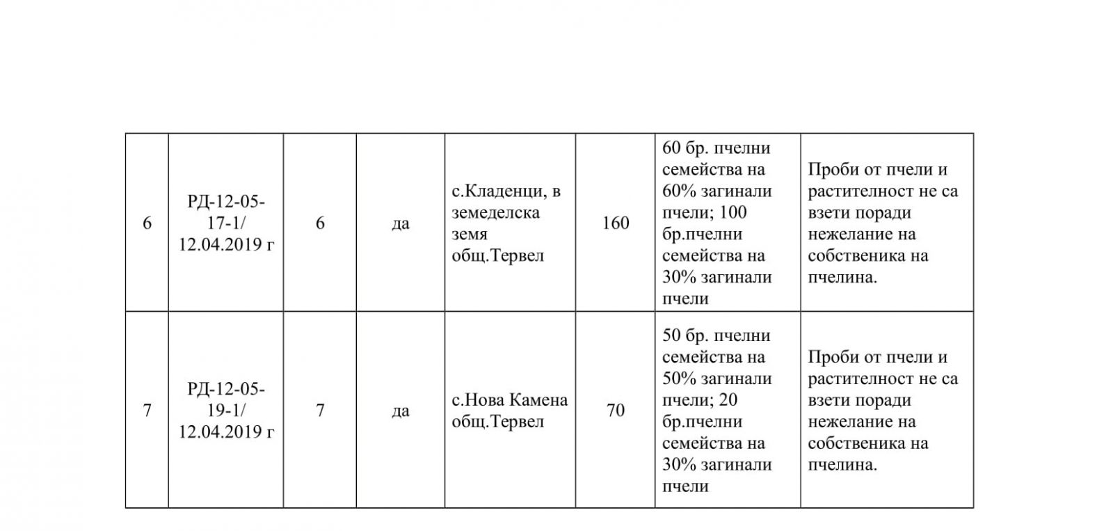 При извършване на проверките по места се установяват, че много често не са налични регистрации на пчелините и пчелните семейства съгласно чл.8, ал.1 от Закона за пчеларството. Установено е и непознаване на законовите нормативи от страна на земеделските стопани. Пчеларите масово не се съобразяват с необходимостта да се регистрират и да оповестяват местопребиваването на пчелините си - стационарни и подвижни, както и да оставят актуални телефони за връзка с тях. 100 % погинали пчелни семейства са регистрирани в село Пчелник и частен имот в околностите на Албена. Там са измрели съответно по 150 и 90 кошери.