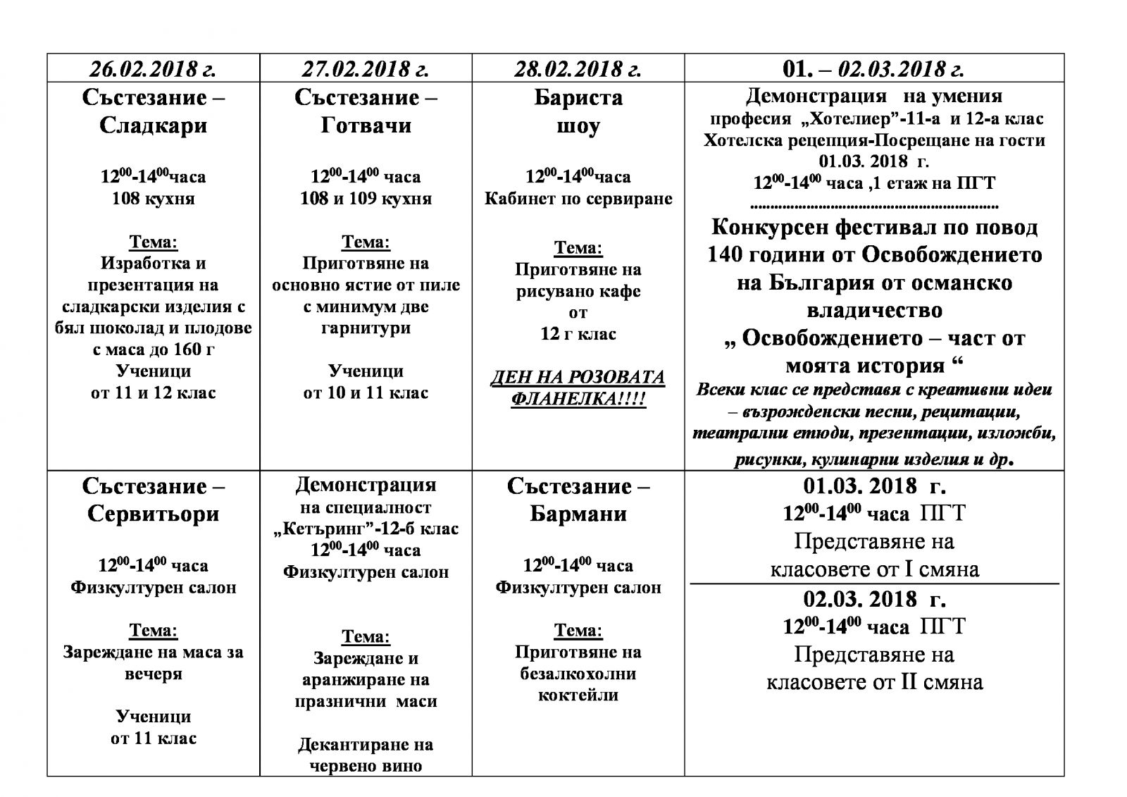 Интересна, предизвикателна, вкусна и ароматна ще бъде следващата седмица в Професионалната гимназия по туризъм „Пейо К. Яворов“ в Добрич. Всеки от дните, от 26 февруари до 3 март, е професионално обозначен. Целта е да покажем на по-малките ученици какво умеят по-големите, разказва директорът на гимназията Нели Апостолова. Седмицата на предизвикателствата, както са я нарекли, е посветена и на 50-годишния юбилей на училището. Всеки ден учениците ще показват на живо пред гости своите умения от 12.00 до 14.00 часа. В понеделник, 26 февруари, ще започнат със сладкарство. Изработка и презентация на сладкарски изделия с бял шоколад и плодове. Състезанието за готвачи е във вторник - 27 февруари. Темата за майсторите е „Приготвяне на основно ястие от пиле с минимум две гарнитури“.
