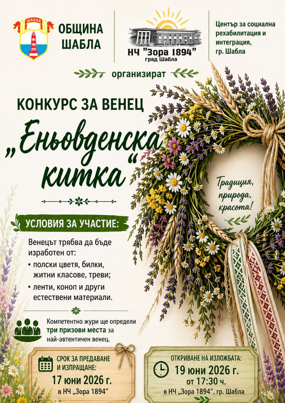 Конкурс за изработка на венец „Еньовденска китка“ организират Община Шабла, Народно читалище „Зора 1894“ и Центърът за социална рехабилитация и интеграция – Шабла.