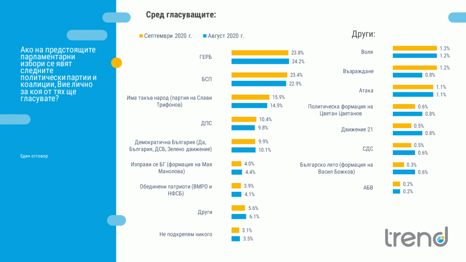 Изследването на “Тренд” през септември не отчита сериозна динамика в електоралните нагласи сред гласуващите сравнено с проучването през август.