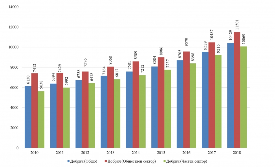 През 2018 г. средната годишна брутна заплата в област Добрич се увеличава спрямо 2017 г. с 9.3%. По-голям е ръстът на заплатите в обществения сектор - с 9.7% и достигат 11 501 лв., а в частният сектор - с 9.3 % - 10 069 лева.