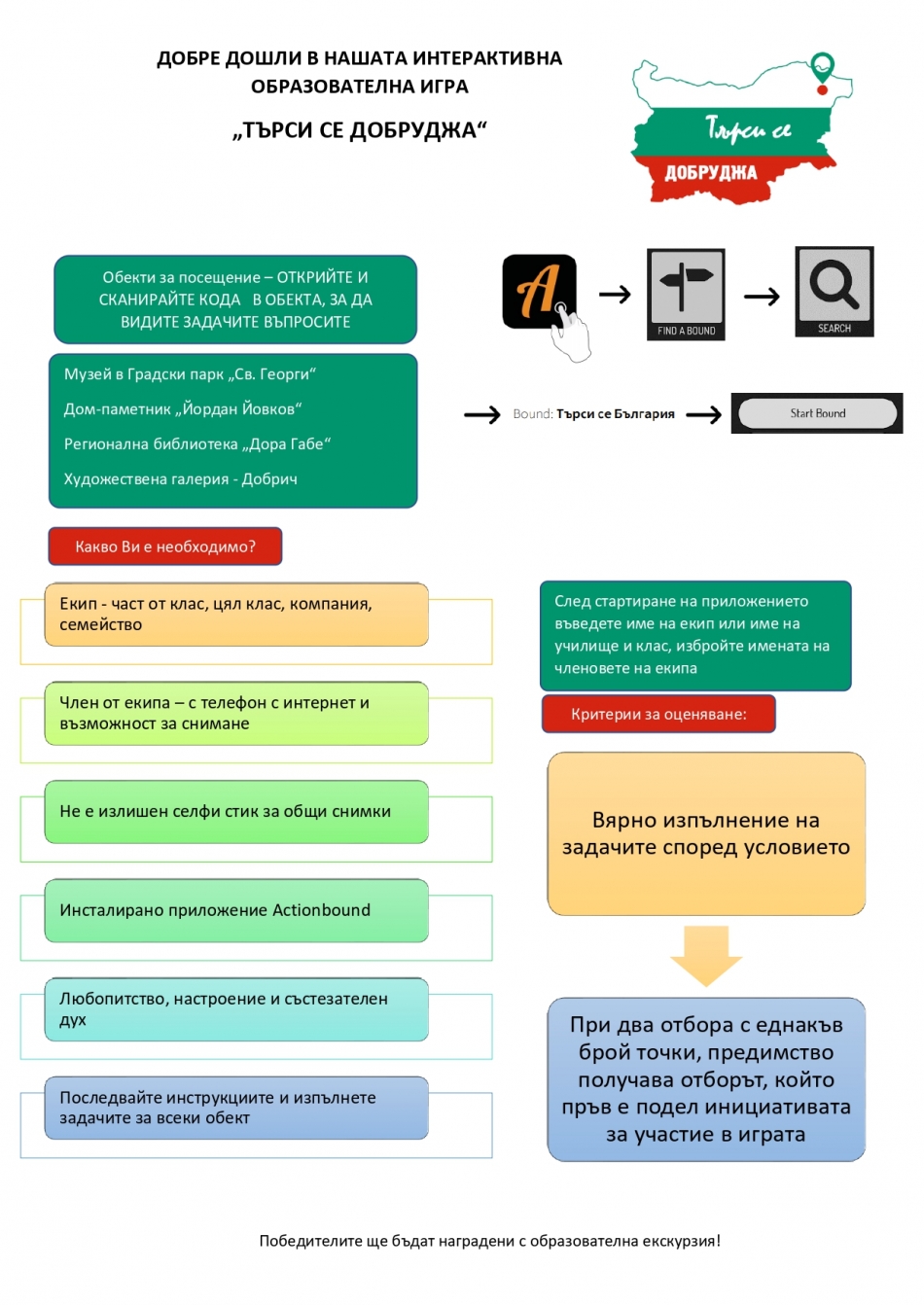 Играта има състезателен характер и е посветена на 25 септември – Ден на град Добрич. Едно от условията е да бъде създаден отбор/екип от приятели, членове на семейства, класове. Предвидени са задачи и няколко обекта за посещение – Регионална библиотека „Дора Габе“, Художествена галерия – Добрич, Музей в Градски парк „Св. Георги“ и Дом-паметник „Йордан Йовков“.Редът за посещение не е от значение. Преди да започне играта, всеки екип трябва да изтегли от GooglePlayActionbound - безплатно мобилно приложение. Изписват се членовете на отборите, след което започва изпълнението на състезателните задачи – във всеки обект са поставени на видно място кодове, които трябва да сканирате, за да видите въпросите, на които трябва да отговорите. Някои от задачите изискват и снимки. Играта е от типа „ловци на съкровища” – включва въпроси, чиито отговори трябва да бъдат открити.
