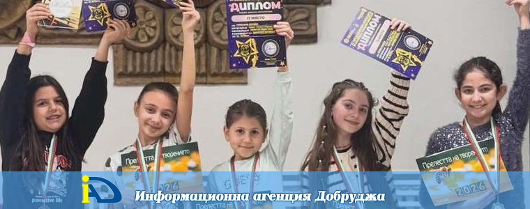 Талантливите деца от Студио за поп-рок певци "Сарандев" към Младежки център в Добрич спечелиха медали от Националния конкурс за вокално и танцово изкуство "Звезден сблъсък" във Велико Търново. Това съобщават от Младежкия център. За добро представяне са отличени Грациела Пачева, Димана Гандева, Ралена Кралева, Ирина Илиева, Елица Колева, Лора Манолова. Положените усилия от страна на децата, както и от техния ръковoдител Доротея Петкова, имат видими резултати, допълват от центъра в Добрич.