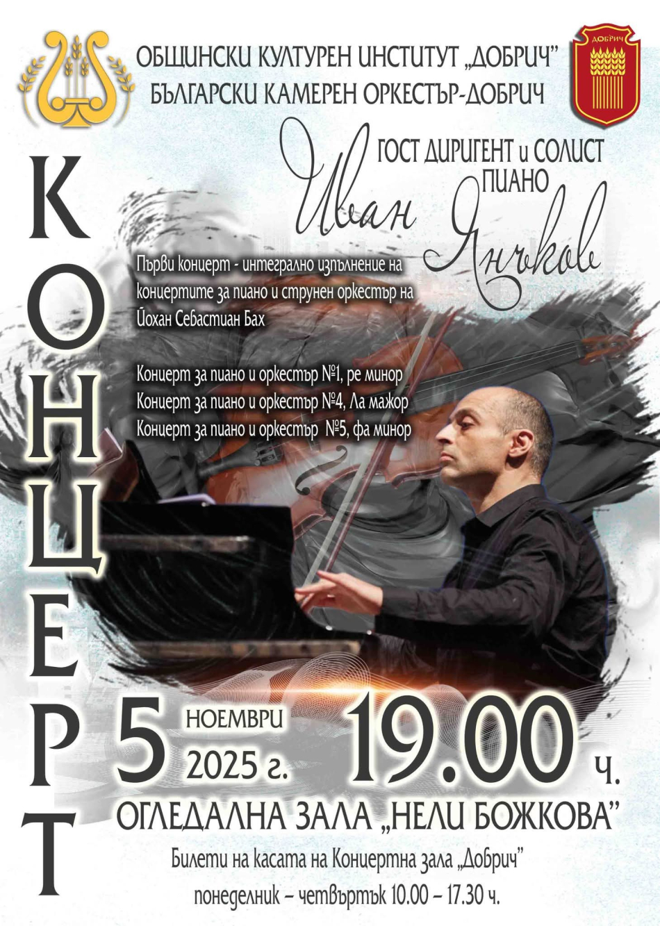 Днес от 19.00 ч. в Огледална зала „Нели Божкова“ добричката публика ще има възможността да се наслади на емблематични Бахови концерти за пиано и оркестър, представени от Иван Янъков – едно от най-разпознаваемите имена в класическата музика днес. Събитието е първият от трите концерта - интеграл на музиканта, посветени на Йохан Себастиан Бах, които ще бъдат изпълнени именно в Добрич.