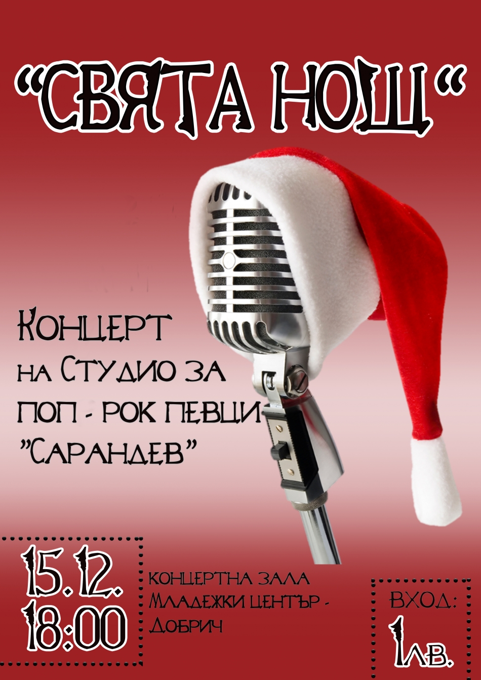 Много красиви песни в духа на Коледа ще прозвучат в концерта „Свята нощ” на Студио за поп-рок певци „Сарандев” при Младежки център - Добрич с вокален педагог Елена Каребельова. Музикалното събитие ще се състои днес от 18:00 ч. в залата на Младежки център. Почитателите на поп музиката ще имат възможността да се насладят на български и световни хитове.