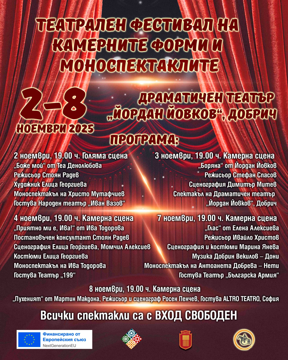 От 2 ноември в Добрич започва нов театрален фестивал, който се осъществява по проект „Добруджа – културен компас: традиция, съвременност и общност“ по процедура чрез директно предоставяне на средства BG-RRP-11.021 „Схема за безвъзмездна помощ „Ново поколение местни политики за култура за големи общини“, финансирана в рамките на Компонент 11„Социално включване“, Инвестиция С11.I6: Развитие на културните и творчески сектори на Механизъм за възстановяване и устойчивост на ЕС. Фестивалът се реализира от Регионален исторически музей – Добрич в рамките на дейността „Поглед в Йовковия свят“ и се посвещава на 145 години от рождението на белетриста.