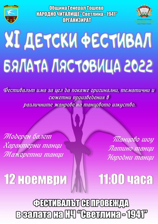 240 деца от областите Добрич и Варна, ще вземат участие в 11-ото издание на фестивала на детския танц „Бялата лястовица“, който ще се проведе на 12 ноември в Генерал Тошево.
