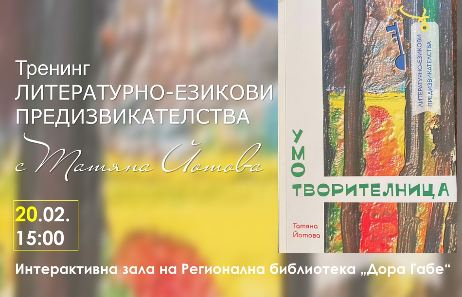 На 20.02.2025г. от 15.00 часа в интерактивната зала на Регионална библиотека „Дора Габе” ще се проведе безплатен тренинг за любителите на българския език. Поканата е насочена към учители по Български език и литература, прогимназиален етап, начални учители, родители и всеки, който иска да научи нови техники за стимулиране интереса и провокиране въображението на децата и учениците. Организатор на срещата - Център за неформално образование и личностно развитие, Център НОЛъР, град Добрич.