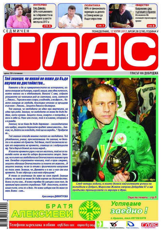 Този брой на вестник „Глас“ посвещаваме на Дякона, на Апостола, на Човека Васил Левски. Каквито и да са превратностите на историята, когато говорим за българи, народ има една личност, която винаги ни е обединявала. Винаги! С име, събрало усещането на човешкия род за светлина, със сила, със святост ... Левски... Търсим в него и вяра, и надежда, и мъдрост... Когато говорим за свобода, безспорно отново се връщаме към него – Левски... Защото Левски е България. 180-ата година от неговото рождение отбелязваме на 18 юли. Представяме Ви сказката на професор Пламен Митев, историк от Софийския университет, за Левски.