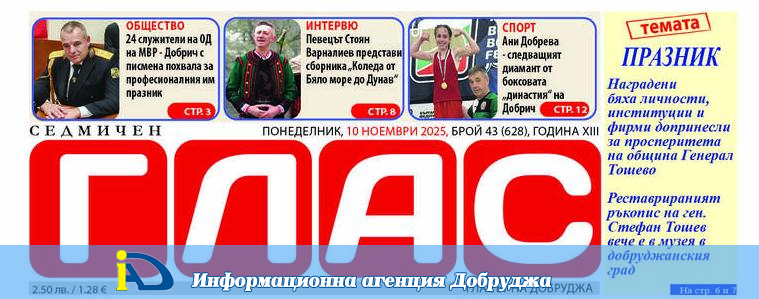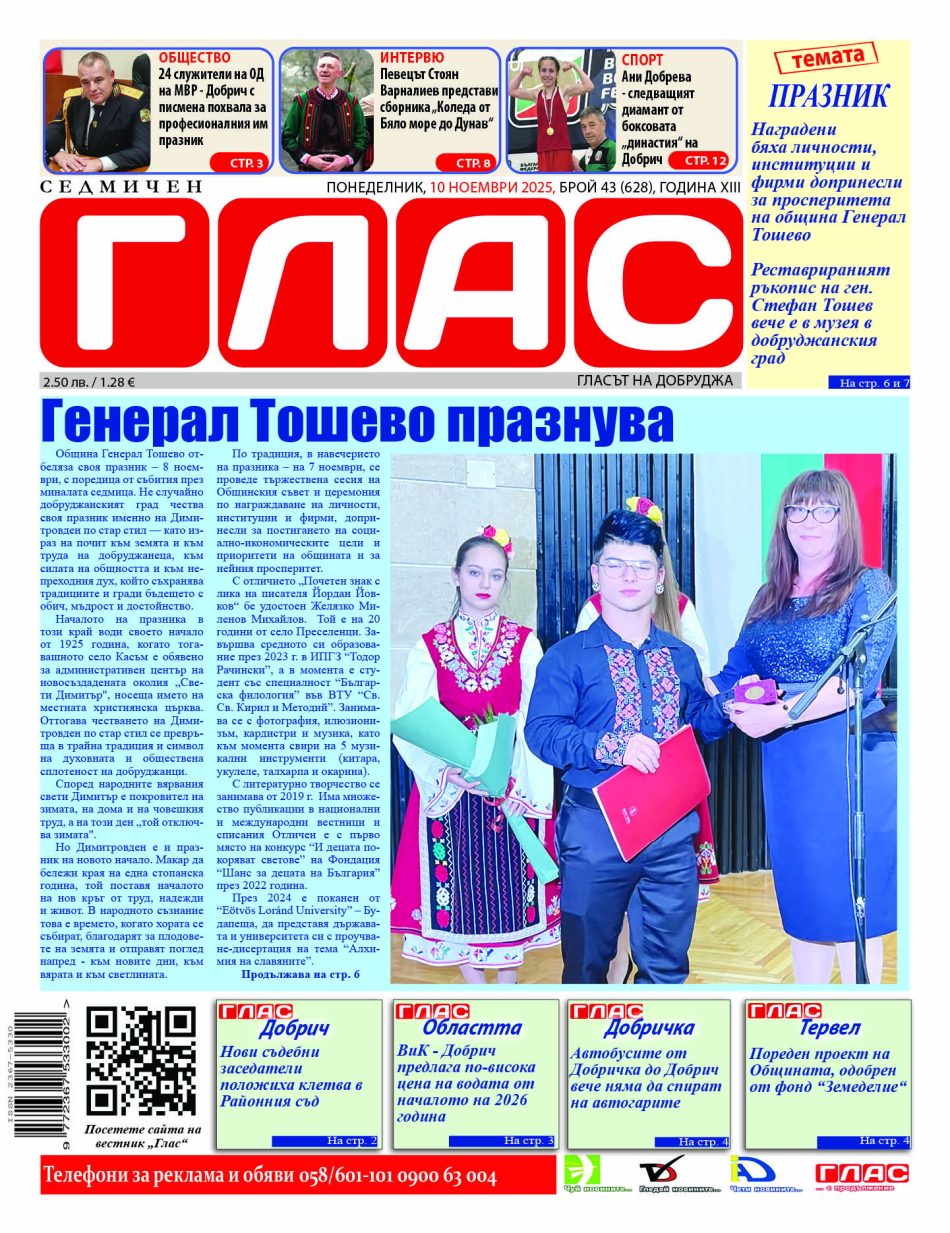 Община Генерал Тошево отбеляза своя празник – 8 ноември, с поредица от събития през миналата седмица, като кулминацията в програмата бе на Димитровден – 8 ноември. За събитийната програма, за наградените личности, институции и фирми, допринесли за просперитет на общината и как бе почетена паметта на патрона на община Ген. Тошево – ген. Стефан Тошев, можете да прочетете на стр. 1, 6 и 7. В новия брой на в. „Седмичен ГЛАС“.