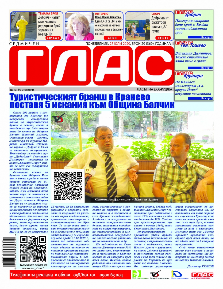 Намаление на данък сгради и такса смет искат представители на туристическия бранш в село Кранево. По тази тема е водещата статия на последното издание на в. СЕДМИЧЕН ГЛАС. Общо пет са исканията към Община Балчик, подкрепени от собствениците на 200 хотела и ресторанта в курортното селище, каза Станислав Димитров, управител на хотел „Кристел парк” в Кранево. Подробности четете на първа страница на вестника.