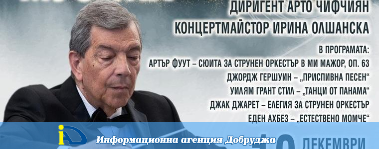 На 10 декември от 18:30 ч. в Огледална зала „Нели Божкова“ Български камерен оркестър – Добрич кани публиката на специална Вечер на американската музика – концерт, който разкрива разнообразието и богатството на музикалната култура в САЩ. Под диригентството на Маестро Чифчиян ще прозвучат произведения, вдъхновени от ранните симфонични традиции, джазовия стил, афроамериканските корени, ритмите на Централна Америка и калифорнийския свободолюбив дух.