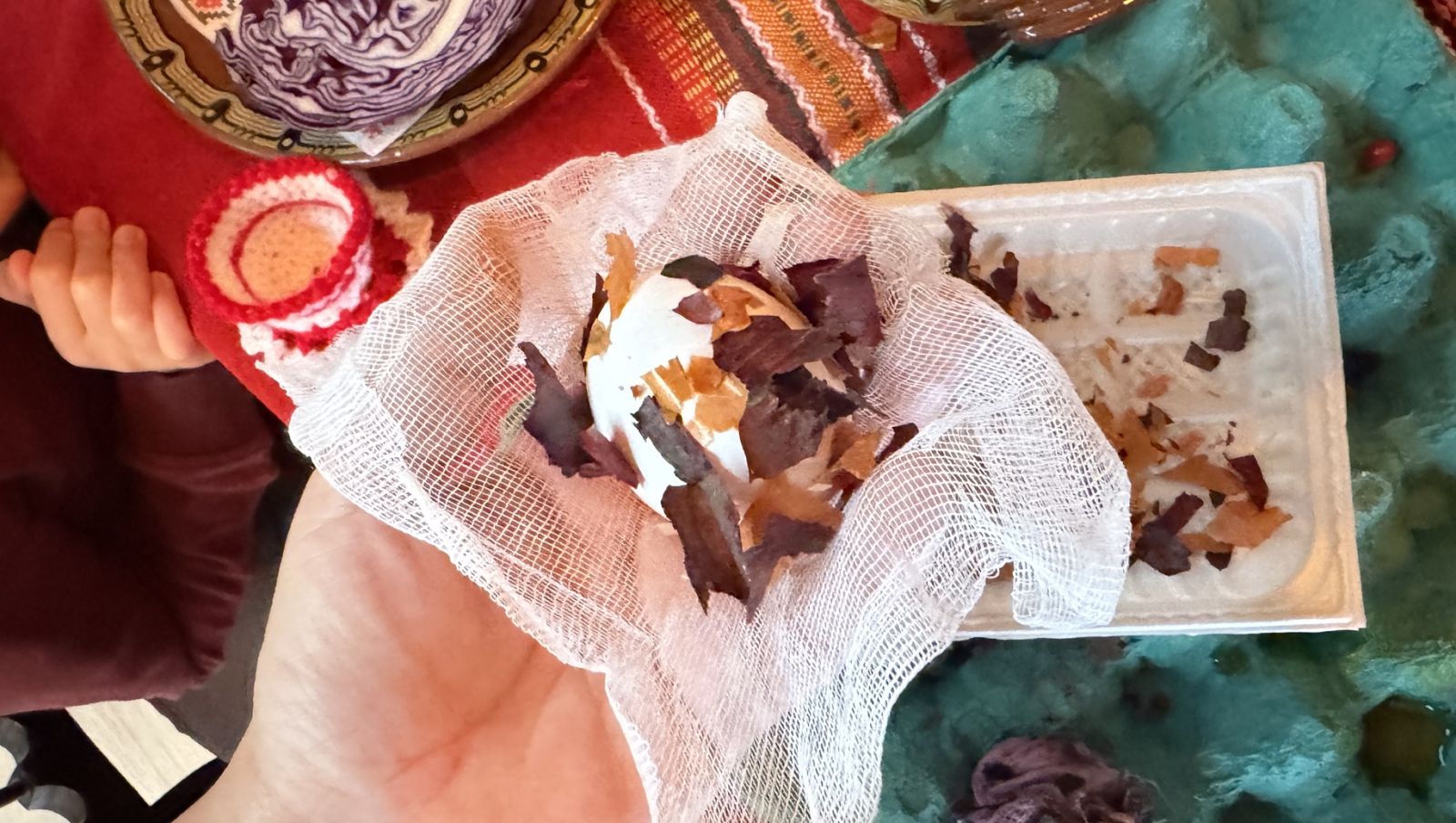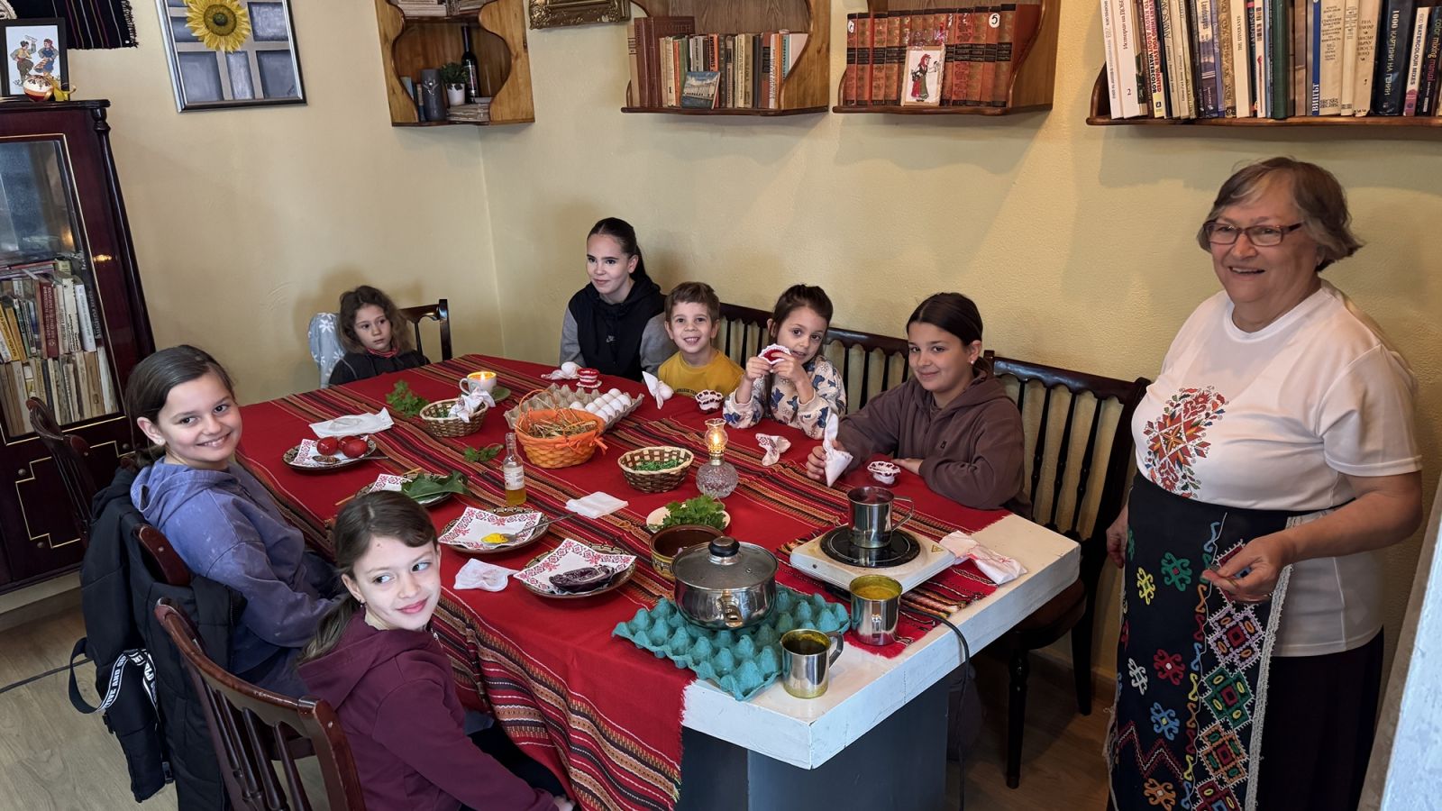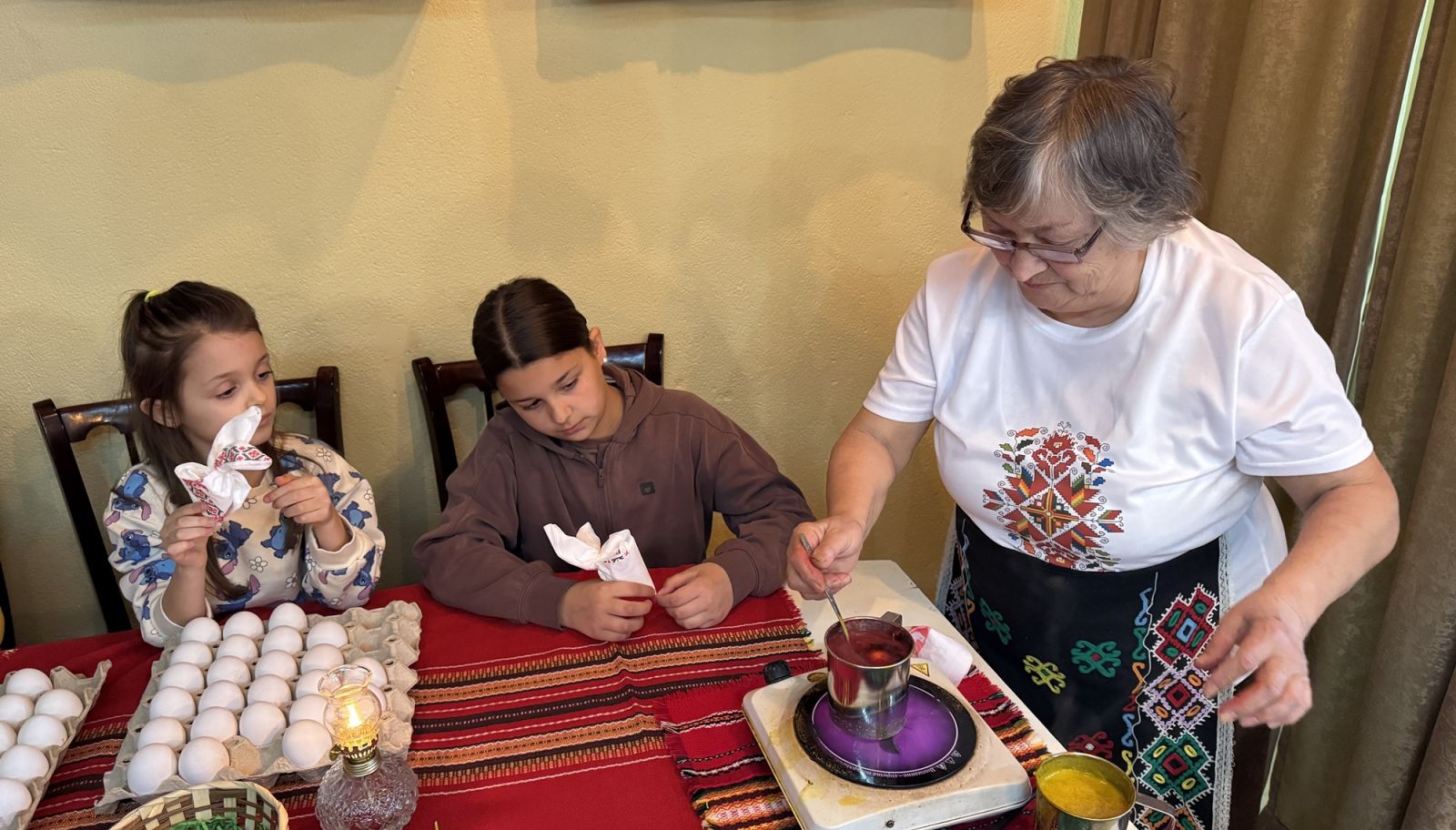 Много деца се включиха в работилницата за боядисване на яйца, която се провежда днес в Народно читалище „Добруджа - 2025“. Малчуганите имаха възможност да оцветят великденски яйца с естествени материали като куркума, червено зеле, цвекло и люспи от лук.