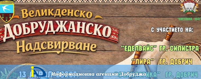 На втория ден от Възкресение Христово – 13 април, в Генерал Тошево, за четиринадесети път ще се проведе Великденско добруджанско надсвирване. Музикалният празник, който няма аналог в страната, ще събере на една сцена общо седем фолклорни оркестри и формации, които ще забавляват публиката повече от четири часа. Събитието ще се състои в залата на НЧ „Светлина – 1941“ от 14:00 часа.