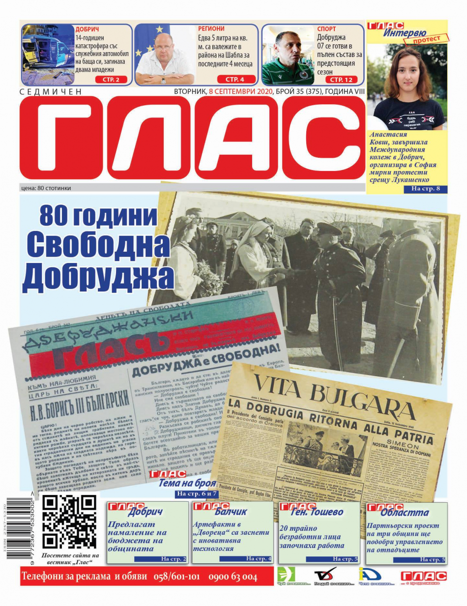 В първият септемврийски брой на вестник „Глас“ ще четете за героизма на българските войни по време на Първата световна война. 104 години от Добричката епопея и 80 години от подписването на Крайовския договор. Първите дни на септември свързваме и с Добричката епопея от която отброяваме 104 години. Затова и Мемориален комплекс „Военно гробище“ е територията на която стъпваме с преклонение и памет за военни подвизи и погубен живот. Военното гробище в Добрич е едно от малкото оригинални и цялостно съхранени до наши дни военни гробища в България и на Балканите. Какви са паметните знаци от подписването на Крайовският договор през 1940 година.Факти и документи от РИМ-Добрич и разказите на Цветан Сашев и Живко Марков.