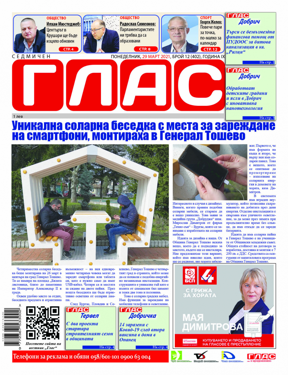 И новият брой на вестник Седмичен ГЛАС Ви предлага богата палитра от информация. Първата страница информира за уникална соларна беседка с места за зареждане на смартфони, която бе монтирана в края на миналата седмица в Генерал Тошево. След Бургас, Пловдив и Севлиево, Генерал Тошево е четвъртият град в страната, който може да се похвали с подобна енергийно независима инсталация. Конструкцията е уникална, тъй като е излята от специален бял цимент и тежи два тона и половина.