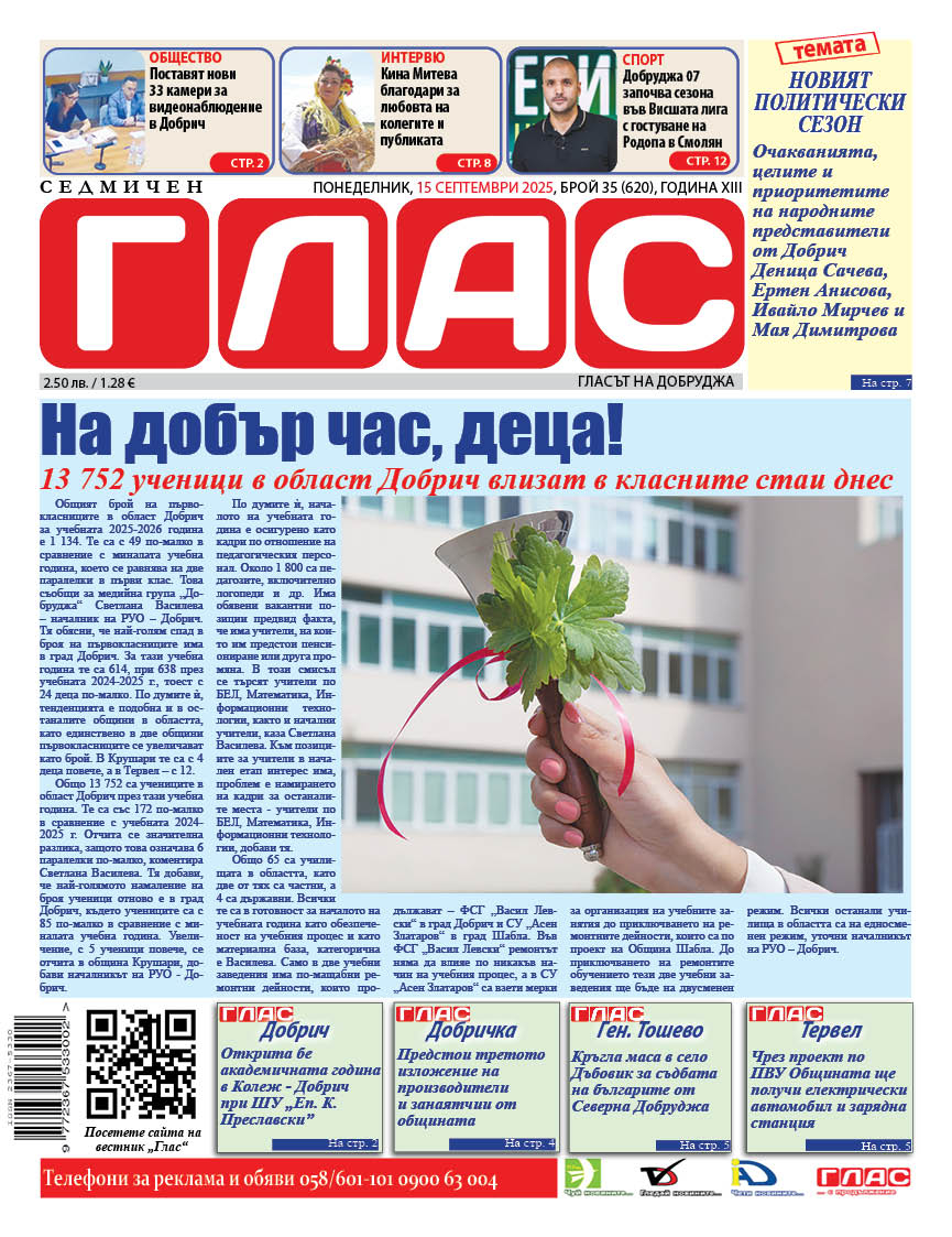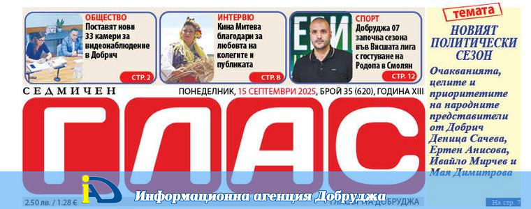 На спортната страница: Волейболният Добруджа 07 започва сезона във Висшата лига с гостуване на Родопа в Смолян. „От много години не се е случвало в Добруджа да има 11 състезатели от Добрич“, сподели президентът и старши теньор на клуба Димитър Маринков.