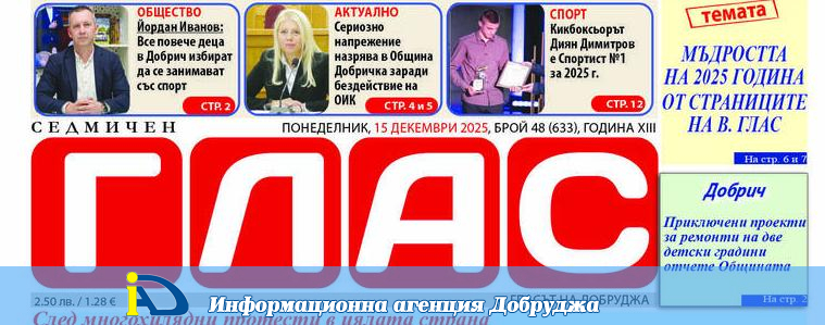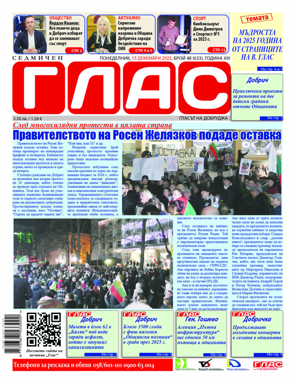 В новият брой на вестник Седмичен Глас ще четете мъдростите на 2025 година. Оставката и протестите отразява изданието от първата си страница. Многохилядни протести в цялата страна в това число и в Добрич и последвала оставка на кабинета Желязков.