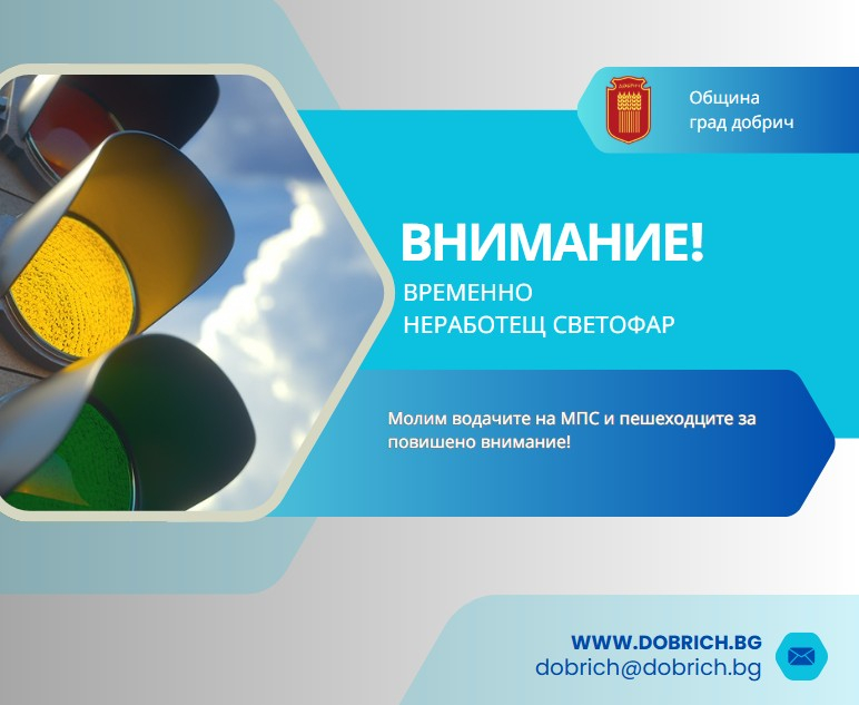 Временно не работи светофарната уредба, която се намира на кръстовището на бул. „Добруджа” с бул. "25-ти септември" /Тракийски/, предупреждават от община Добрич.