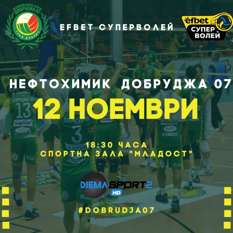 Добруджа 07 гостува днес на Нефтохимик в мач от петия кръг на Ефбет Супер волей. Срещата ще се играе в спортна зала "Младост" от 18:30 и ще бъде предаване пряко в ефира на Диема спорт 2