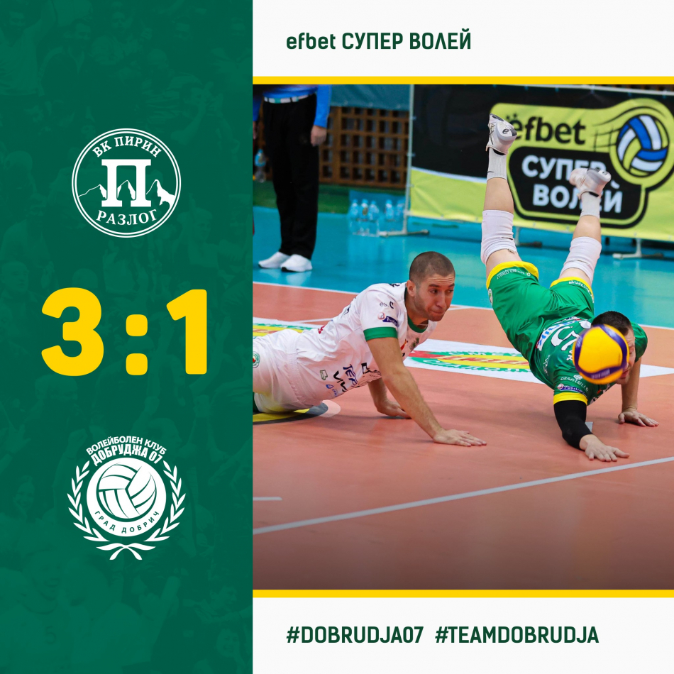 Добруджа 07 загуби като гост на Пирин (Разлог) с 1:3 гейма в мач от четвъртия кръг на Ефбет Супер волей.