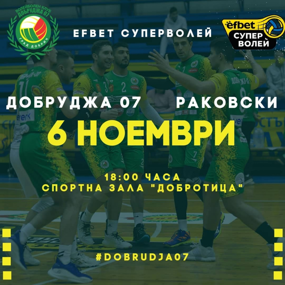 Добруджа 07 посреща днес Раковски в мач от четвъртия кръг на Супер волей. Срещата е от 18.00 часа в зала „Добротица“, като съгласно заповедта на министъра на здравеопазването, ще бъдат допускани зрители, притежаващи „зелен“ сертификат.