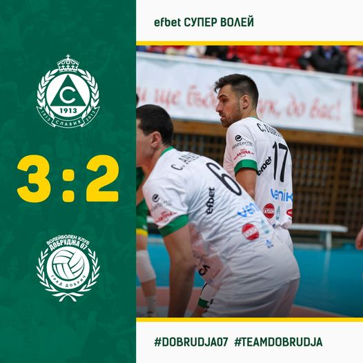 „Добруджа 07“ загуби като гост на Славия с 2:3 в среща от втория кръг на Ефбет Супер волей. Домакините спечелиха първите два гейма с 25:22 и 25:17, но състезателите на Дани Милушев успяха да се мобилизират и да изравнят до 2:2, като спечелиха геймовете на 18 и 16. Тайбрекът бе изключително равностоен. В един момент „белите” поведоха с 12:8, но добруджанци реализираха серия и изравниха за 12:12.В крайна сметка столичният тим се наложи със 17:15, с което спечели и двубоя.