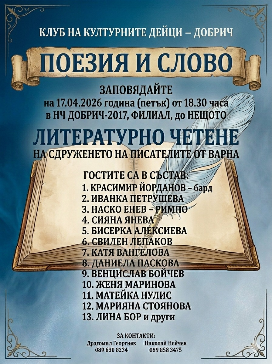 Събитието ще се проведе днес от 18:30 часа в Лайв клуб „Добрич“ и е отворено за всички, които имат интерес към литературата и културния живот.